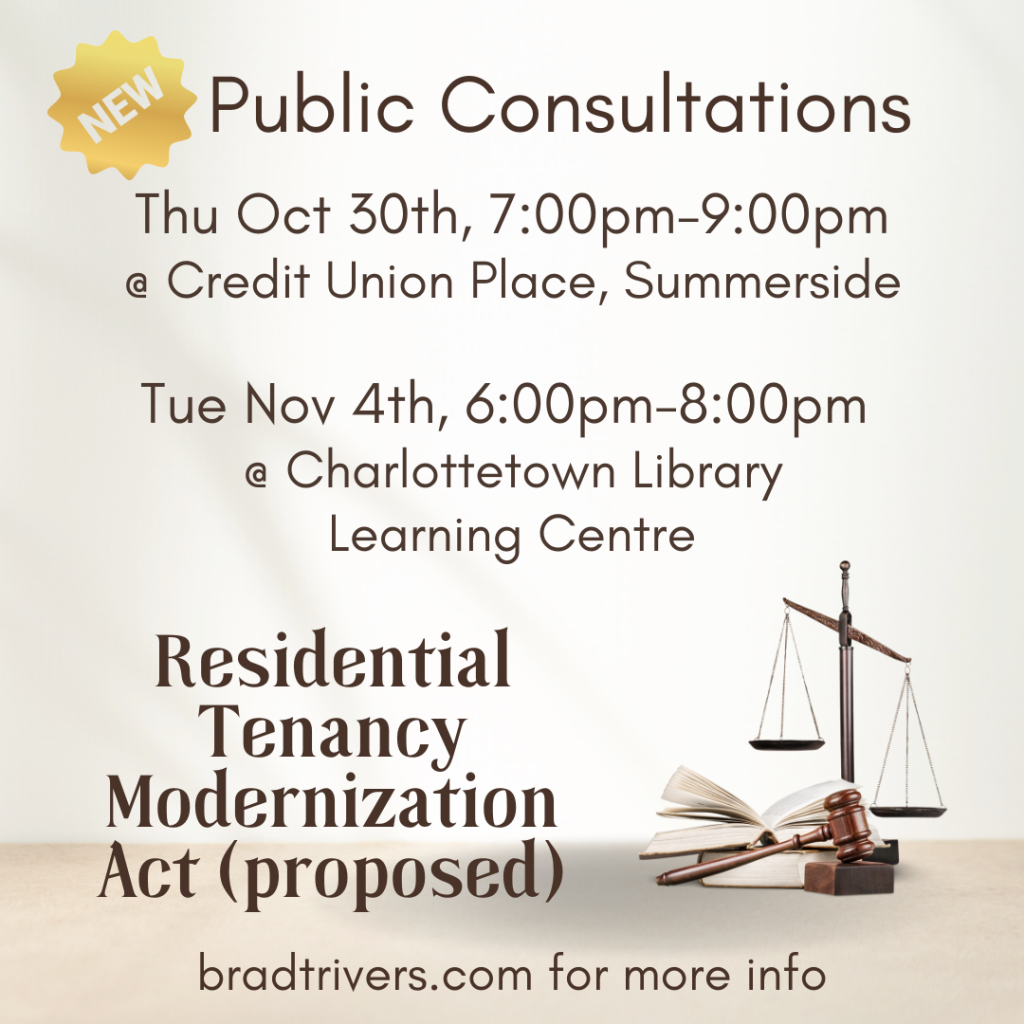 Feedback on the new version of the Residential Tenancy Modernization Act (RTMA) continues. Incorporating feedback a new version 1.1 has been released. It furthers the goal of this proposal to build a rental framework that is fair for tenants, viable for landlords, and sustainable for Prince Edward Island.